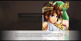 This is a very short (circa 1000 words) "baby's first VN" (pun very much intended), designed to salvage the overlong ending I wrote for a platformer than never came to fruition. It was going to take place on pictures of real clouds! It was such a cool idea! But taking suitable pictures of clouds is hard... Anyway, the choice of locale is what originally inspired my use of "Kid Icarus" characters--and I'm going to be honest, I haven't played "Uprising" in years, so sorry if the lore is wrong. I just went with what little the wiki's character pages had to say and made up stuff from there.